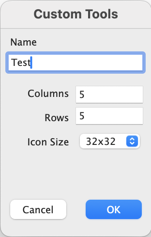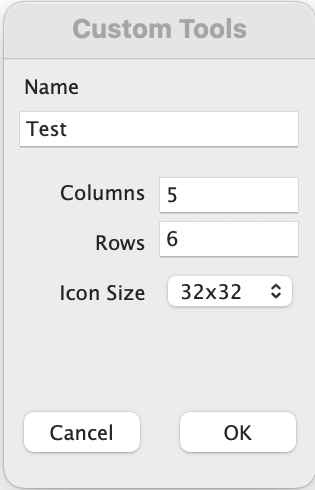 Set the desired Name, Columns, Rows and Icon Size for the palette. It will create a new palette based on the values you enter.