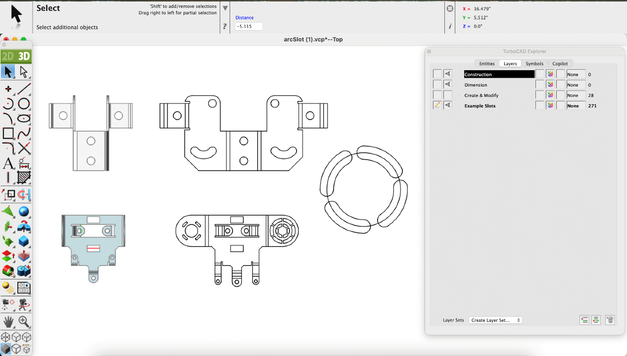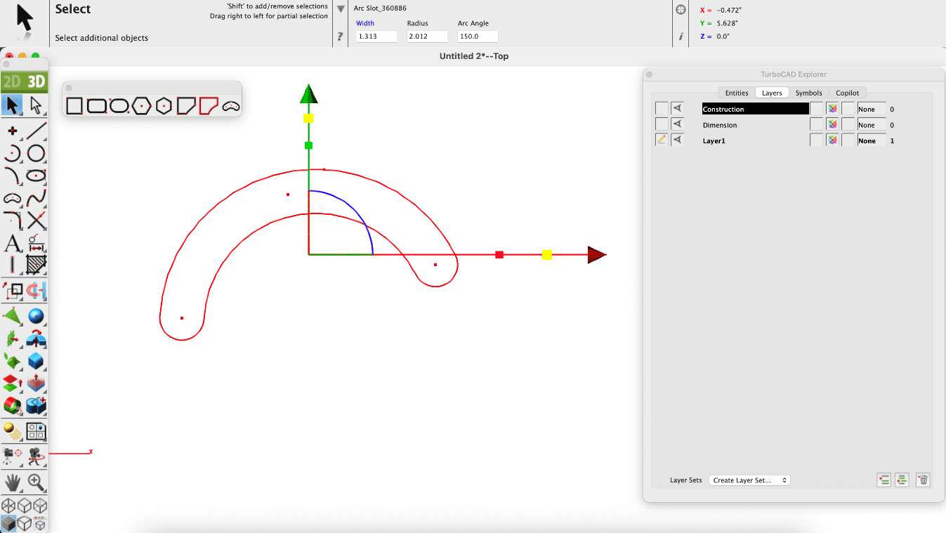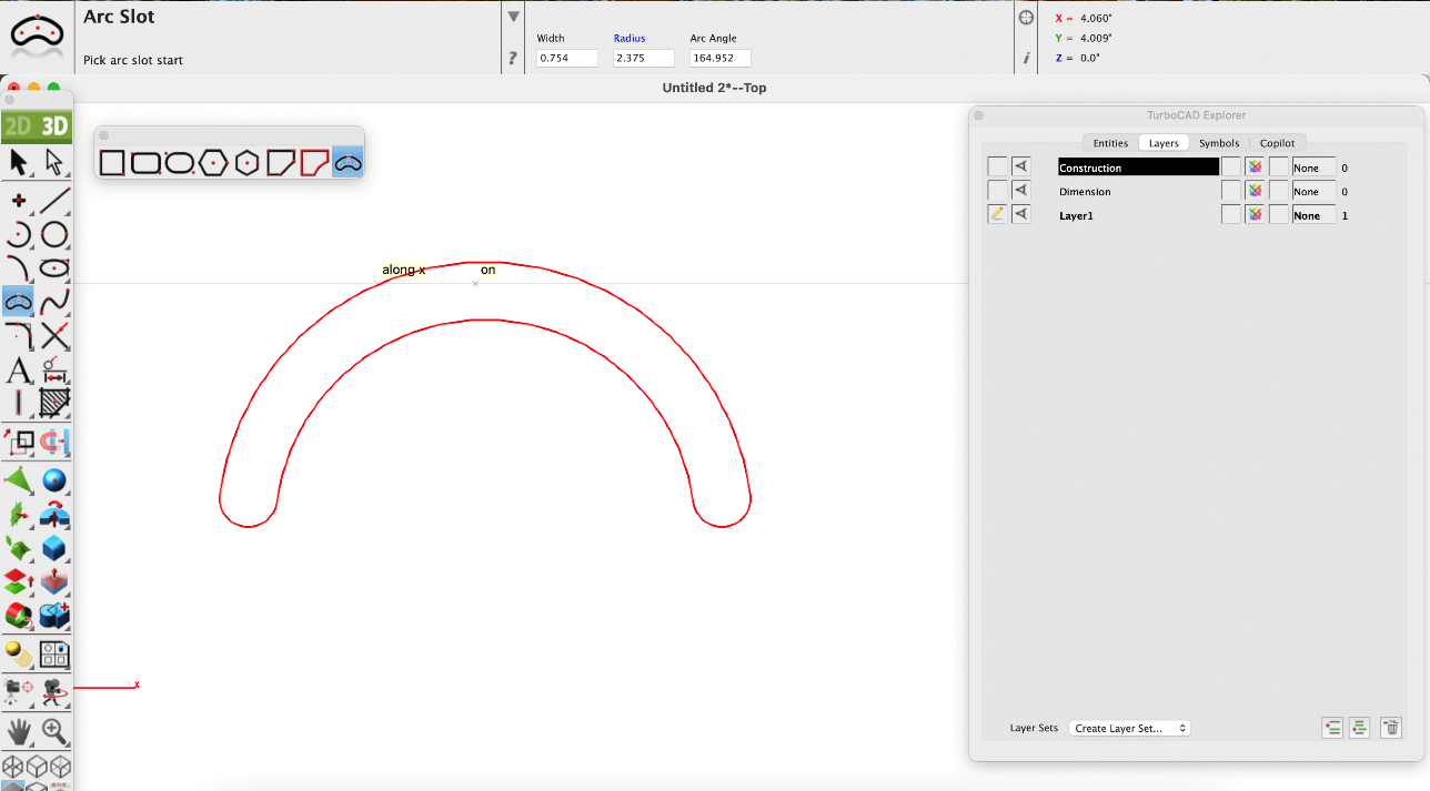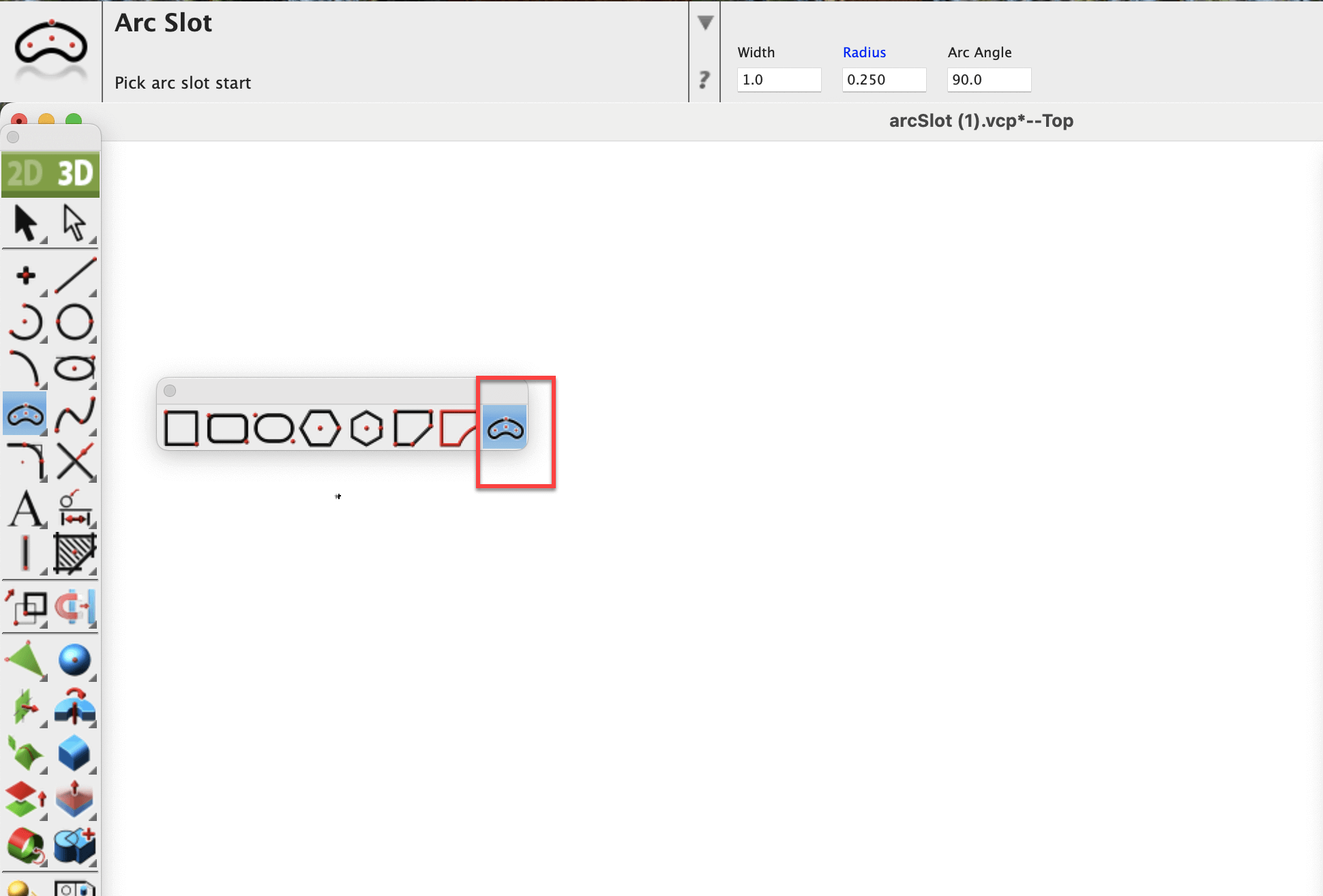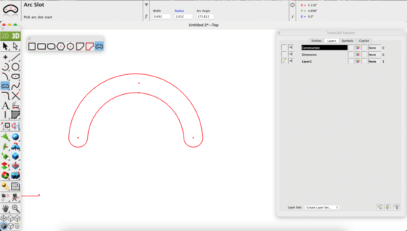 To create an arc slot, simply set a start point, an end point, a point on the middle of the arc, and then define the width of the arc. The slot is drawn automatically, giving you a clean and accurate curved shape.