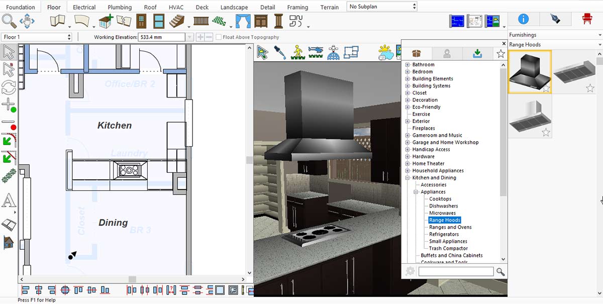 Now it’s time to place the range hood above the cooking range. To do this, go to Display Stock Library Items > Kitchen and Dining > Appliances > Range Hoods.
