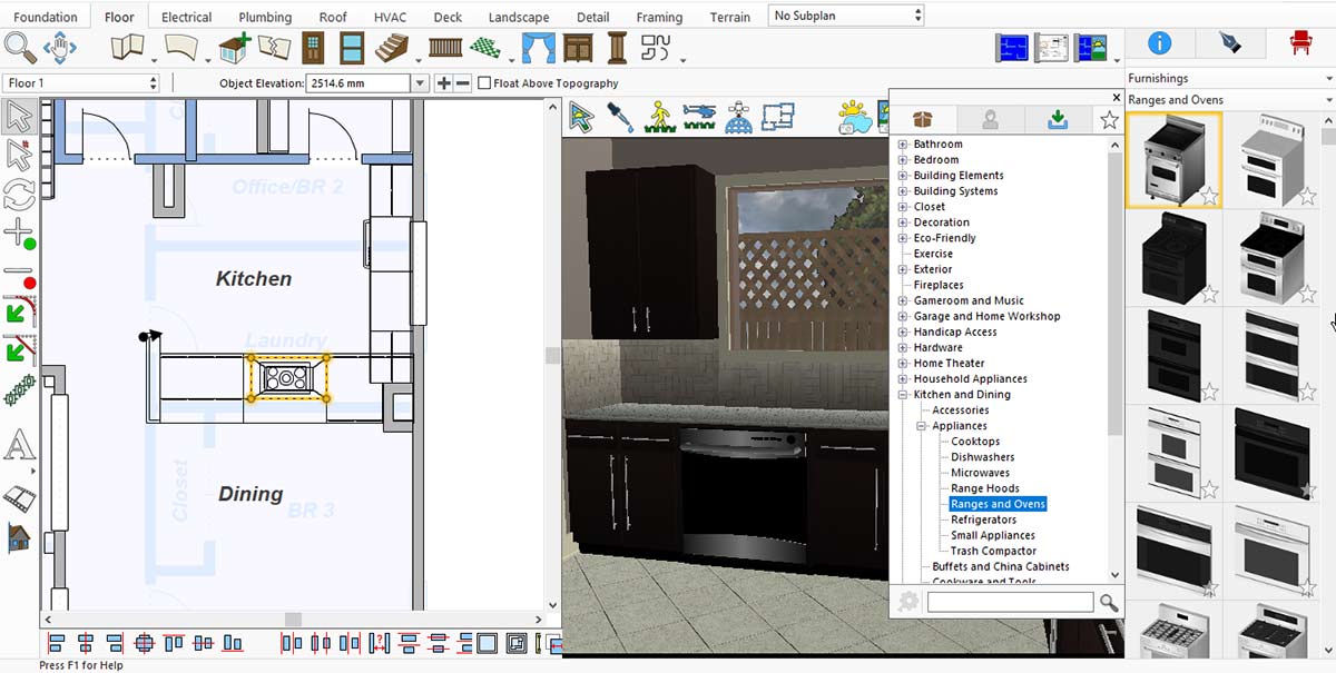 In the same way, we can place an oven in our kitchen. For this, go to Display Stock Library Items > Kitchen and Dining > Appliances > Ranges and Ovens.