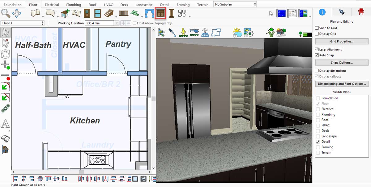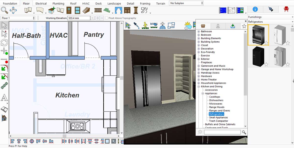 A modern kitchen is incomplete without a refrigerator. To place one, go to Display Stock Library Items > Kitchen and Dining > Appliances > Refrigerators.