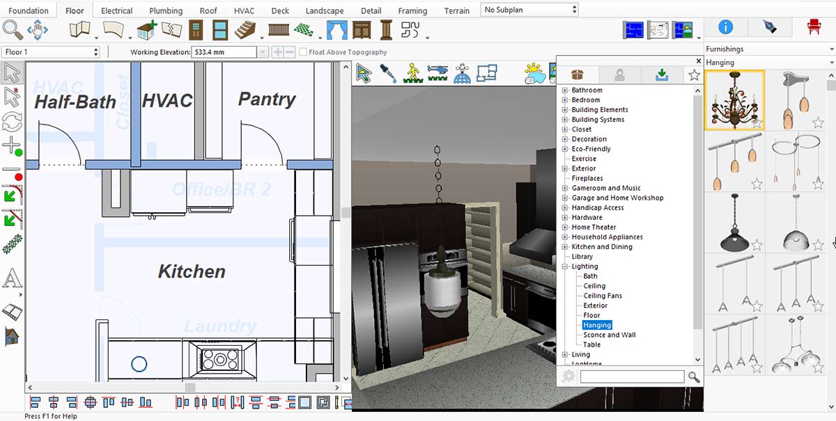 Lighting is essential in a modern kitchen. To add modern lights, go to Display Stock Library Items > Lighting > Hanging.