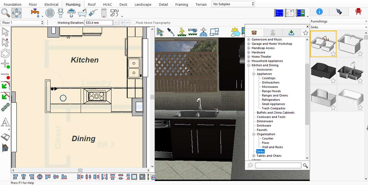 A modern kitchen is incomplete without a stylish sink. To place one, go to Display Stock Library Items > Kitchen and Dining > Sinks.