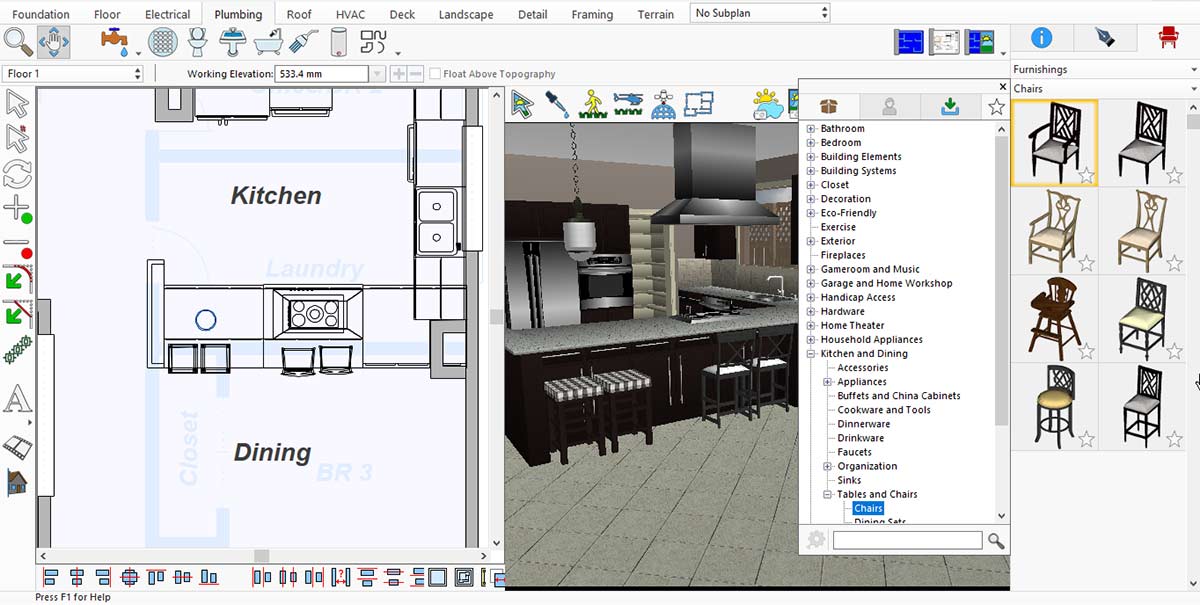Furniture is also an important element in a modern kitchen. To add modern pieces like chairs, go to Display Stock Library Items > Kitchen and Dining > Tables and Chairs > Chairs.