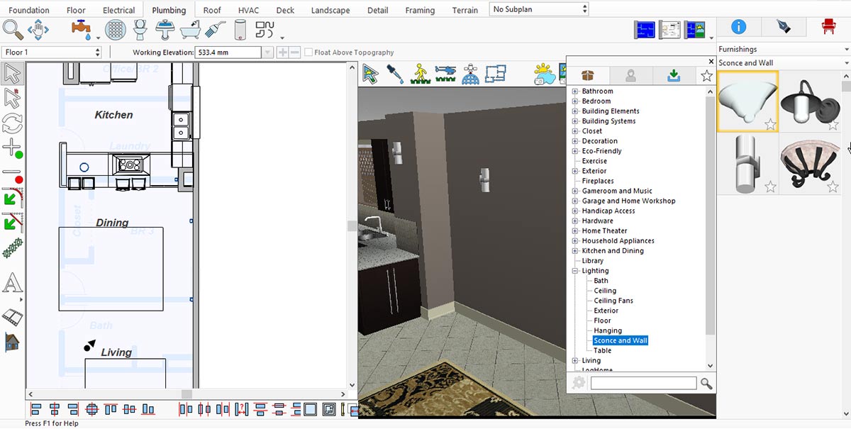 Fancy wall lights also play an important role in giving a modern look to your kitchen. To place them, go to Display Stock Library Items > Lighting > Sconce and Wall.
