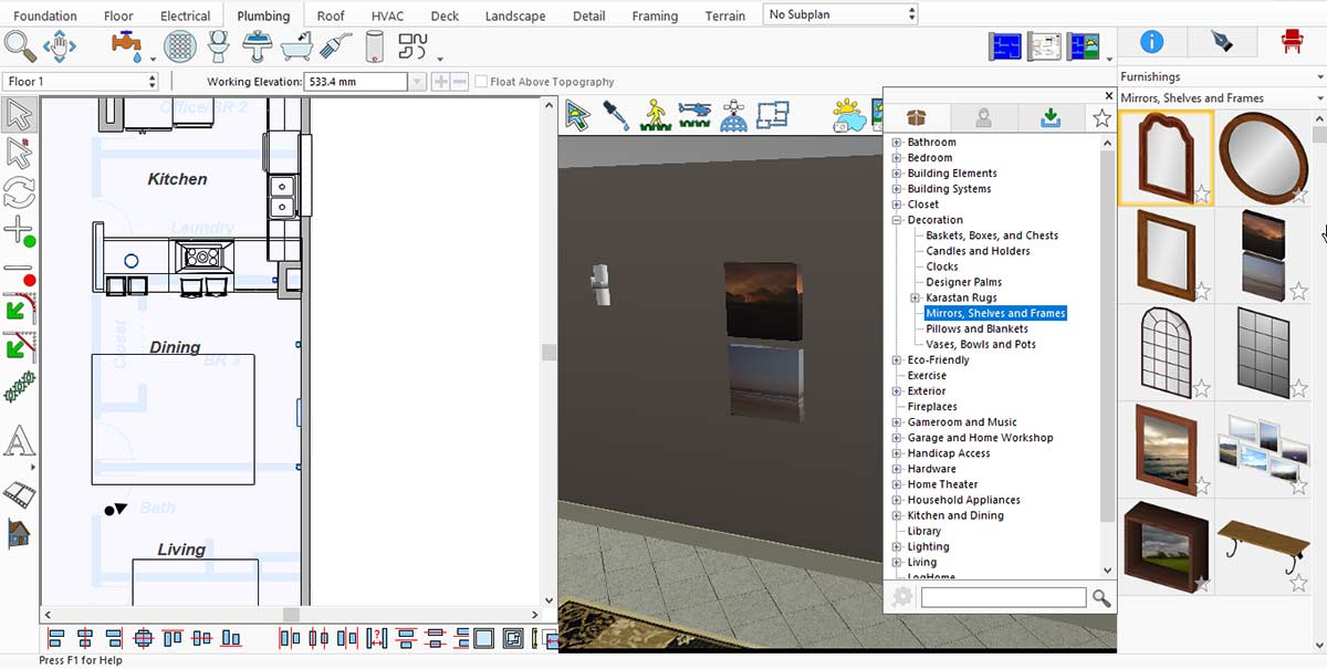 Similarly, framed images on the walls contribute to a modern kitchen look. To place them, go to Display Stock Library Items > Decoration > Mirrors, Shelves, and Frames.
