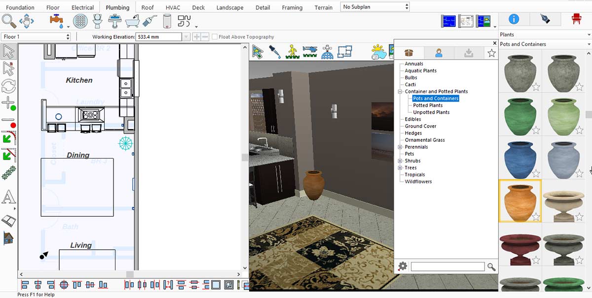 A kitchen feels incomplete without a flower pot. This app offers a wide range of flowers with pots, but if none meet your needs, you can place an empty pot and add flowers later. To place a pot in your kitchen, go to Plants > Display Stock Library Items > Container and Potted Plants > Pots and Containers.