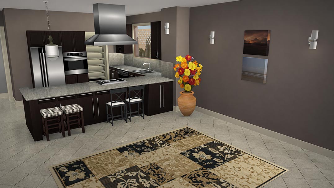 Adding a carpet can enhance the appeal of your kitchen. To place one, go to Display Stock Library Items > Decoration > Karastan Rugs.